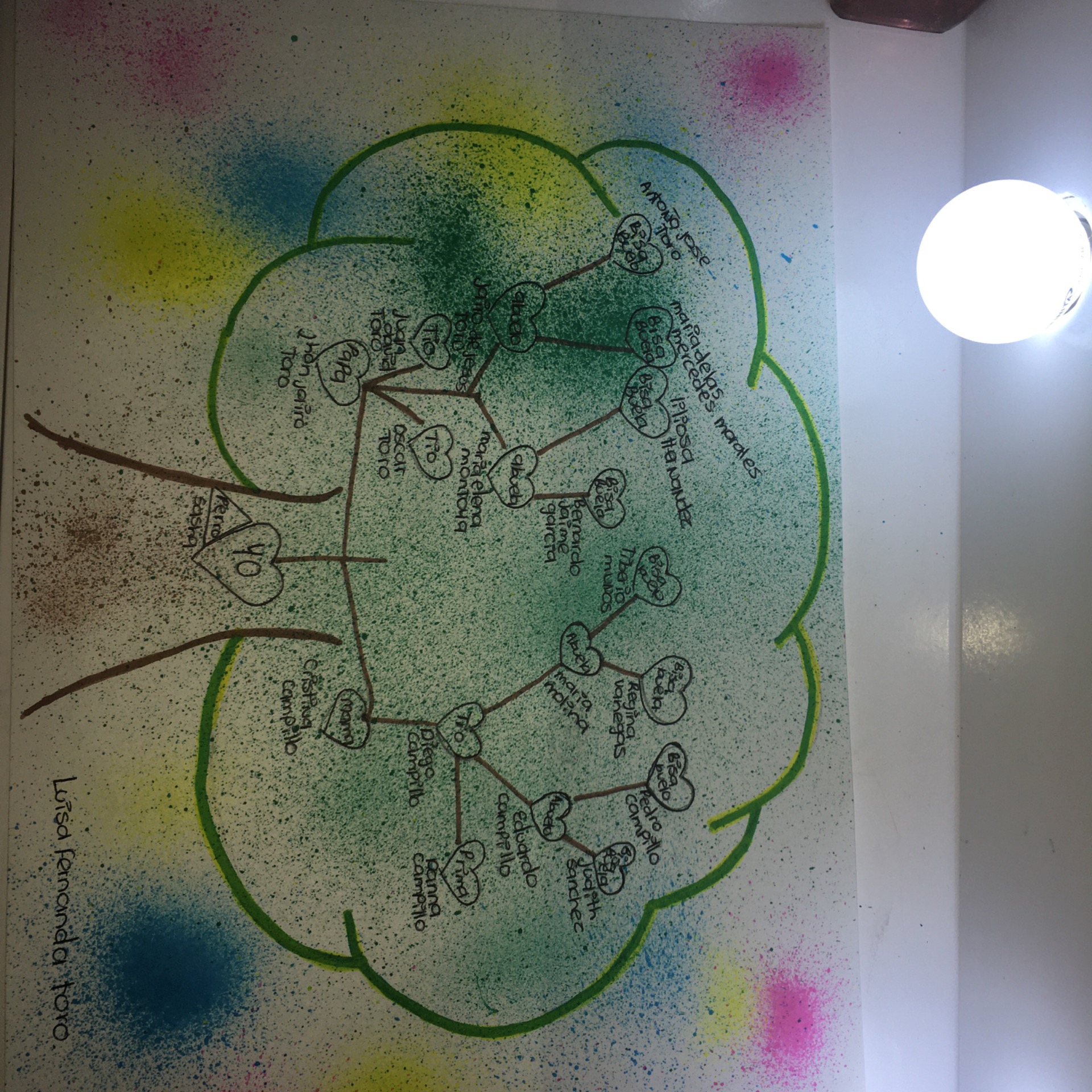 Realiza el árbol genealógico de tu familia considerando las diversas generaciones de tu familia desde el linaje de madre y de padre, abuelos, bisabuelos, tatarabuelos, entre otros. Hasta donde logros adquirir mayor información. La idea es colocar el nombre y la relación que tiene contigo, se puedes colocar fotografías mejor, o dibujos, se grafica en un árbol como el que está representado acá, este es solo un ejemplo deja que la creatividad se desborde.