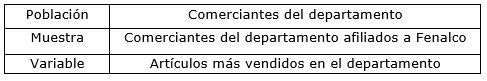 Fenalco Antioquia realizó una encuesta a sus comerciantes afiliados con el propósito de conocer los artículos más vendidos en el departamento, obteniendo los siguientes resultados: