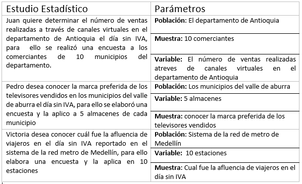 Situaciones como la anteriormente mencionada, constituyen el campo de estudio de la estadística. Cuando se lleva a cabo un estudio estadístico se deben tener en cuenta aspectos tales como la población, la muestra y las variables entre otros.