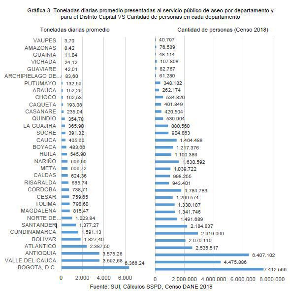 Por otra parte, los 4 departamentos que menos reportan toneladas dispuestas son Vaupés (3,70 Ton/día, 0.01%), Amazonas (8,42 Ton/día, 0.03%), Guainía (11,84 Ton/día, 0.04%) y Vichada (24,12 Ton/día 0,08%). Estos departamentos no alcanzan a representar el 2% del total de los residuos dispuestos diarios del país.