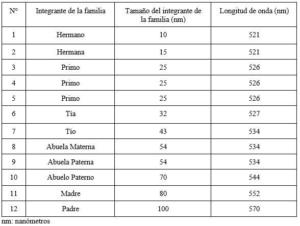 El valor que presenta mayor frecuencia o moda en la longitud de onda de los Integrantes de la familia de Ava es de 570